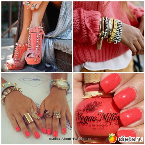 Его не должно быть много – одна яркая вещь придаст роскоши всему образу, будь то пиджак или юбка. А можете обойтись лишь коралловыми аксессуарами – кольцом, серьгами, сумкой.