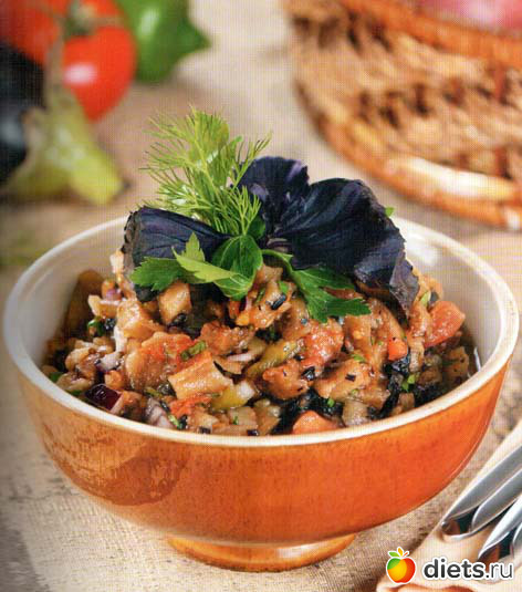 8 баклажанов, 8 помидоров,1 острый зеленый перчик, 1 пучок кинзы, 1 пучок базилика, 1 крупную красную луковицу, 4-5 зубчиков чеснока, соль, молотый черный перец, 1 ст. л. 6%-го уксуса, 3-4 ст. л. растительного масла.