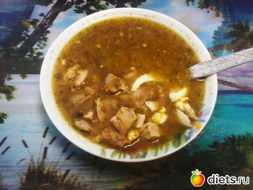 Обед: Супчик из окоророчка тушоного в мультиварке (окорочек, специи для шашлыка (поэтому супчик такого вечелого цвета и яичко вареное)