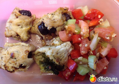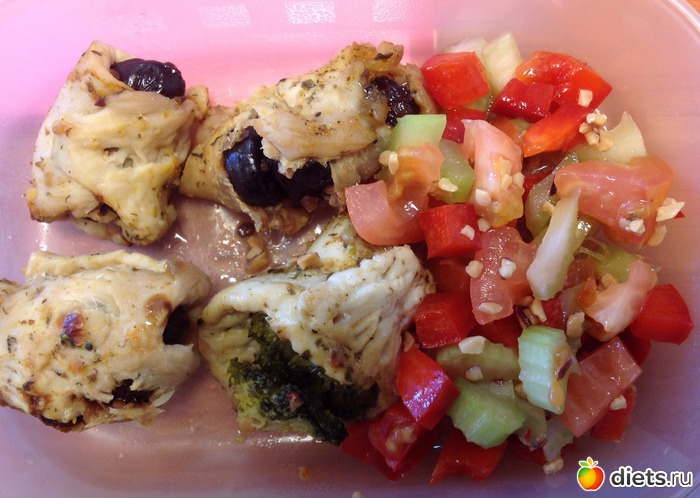 Обед - 3 куриных рулетика с черносливом и 1 с брокколи, остатки салата с со вторника.
