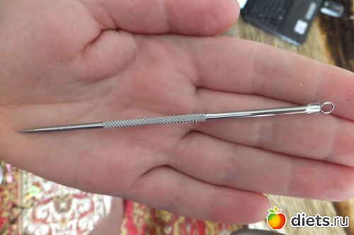 2) После распаривания, начинаю его чистить ( не давлю), а специальной косметической палкой-капалкой... Там где остро, поднимаю кожицу если надо, а кольцом провожу. Таким образом оно не давя забирает прыЩ ))) Стоит палка-капалка не дорого 50 руб. РФ. Продается в Л~Этуале и всех похожих магазинах.