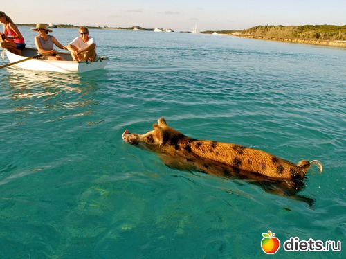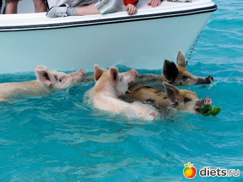 Яхтсмены, путешествующие на Багамах, сталкиваются с невероятным явлением - плавающие свиньи вдоль берегов острова Биг Мэйджор Кэй (Big Major Cay). Этот остров похож на рай для свиней, которые весь день нежатся среди белоснежных песков, а когда голод дает о себе знать, идут добывать пропитание весьма оригинальным способом. Завидев туристов, свиньи смело бросаются в воду и плывут к яхтам, надеясь за красивые глаза получить что-нибудь вкусненькое. Свиньи здесь действительно красивые, разных расцветок и, к тому же, частое пребывание в воде делает их очень чистыми.