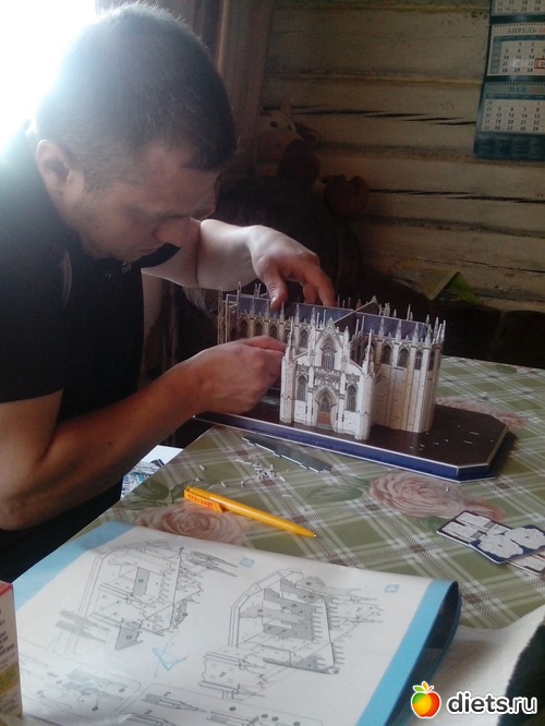 В среду был суматошный день - мать с отцом носились как в попу ужаленные, собирали шмотье, грузили его в машину, писали сценарии и списки, сматывали удочки и копали червей. Все это происходит у них каждый апрель, когда они собираются на рыбалку! Собрались, отец дал отмашку и в ночь на четверг они уехали. По питанию: завтрак каша рисовая, чай, дальше не помню; обед - суп куриный с вермишелью, чай; ужин - макароны по-флотски, много... Все потому, что дичайший перерыв был между обедом и ужином. Покажу вам, за кем мне 2 с лишним недели ухаживать. Это Василиса, ее почти не видно и не слышно, я про нее иногда забываю. Это девчонки! И их папик-петух! Все в кадр не вошли, много их. Дальше идут собаки. Это Бим. Это Рэй. А это самый главный и страшный пес - Бубусик Дэггет! Вчера испортилась погода, поднялся сильный северный ветер и мы сидели дома. Я вышивала, муж кашеварил, Таисия своими делами занималась. Питание: завтрак - овсянка, 2 кусочка рулета куриного, чай; перекус - яблоко; обед - суп куриный; перекус - чай с 1 пряником; ужин - картофельная запеканка с мясом и овощной салат. Муж начал 3D пазл собирать, собор святого Патрика. Вот что пока получилось: Сегодня я решила возобновить тренировки! Йиха! Моей радости нет предела. Решила, что сейчас как раз к месту будет давно пылящийся на жестком диске моего компа комплекс Т25 от Шона Ти. Сделала сегодня на пробу понедельничное кардио, посмотреть как поведет себя шов затянувшийся. Посмотрела, меня все устроило. Пропотела, разогрела все тело, разогнала кровь и разбудила сердечную мышцу. Эйфория! После тренировки решила, что остаток дня я проведу на твороге. Завтрак был такой: омлет с докторской колбасой и сыром (не полезно, но очень хотелось), чай и 1 бутер с творожным сыром; перекус - банан. Потом была тренировка. А после нее обед из творога с бананом и актимелем. Дальше в планах съездить в Орехово-Зуево. Брату надо по магазинам пройтись, к свадьбе своей одежку посмотреть. Сама по рукоблудным магазинам пробегусь, нитки закончились, не хватило немного на вышивку...