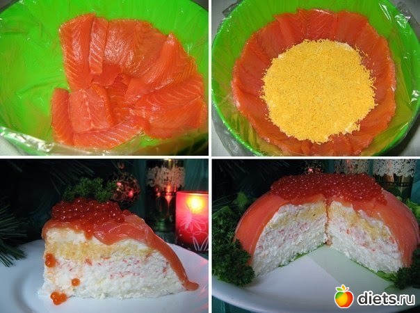 Желатин замочить в воде 0,5 стакана, дать набухнуть, потом на водяной бане растворить. Пока остывает желатин, соединяем до однородной массы - сметану, майонез и сыр. Затем в неё влить, помешивая, желатин. Укладываем слоями: