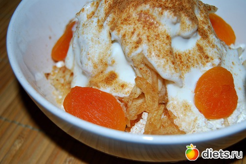 УЖИН: творог 5% с тёртым яблочком, под шапкой из йогурта "Активиа" (без добавок), обильно присыпанный корицей и немного кураги.