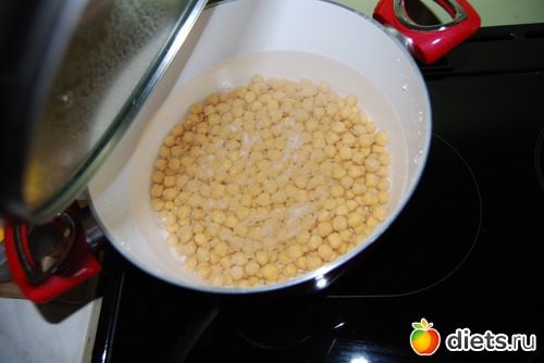 Варить нужно в несоленой воде (соль замедляет варку нута) 10-15 минут кипятить, а затем 40-50 минут варить на слабом огне, ближе к концу варки - посолить.