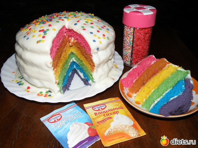 8. Собрать торт, смазывая каждый слой кремом (нижний корж - фиолетовый). Покрыть торт кремом и украсить по желанию или оставить просто белым, смотрится не менее эффектно. Убрать в холодильник на 30 минут.