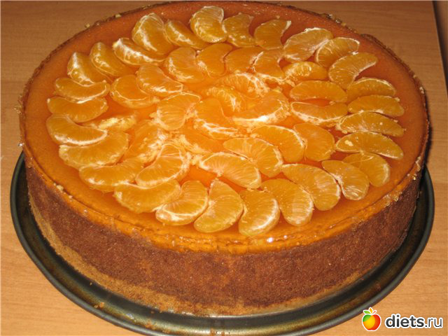Выложить начинку на корж, затем дольки мандарин и печь при 160 градусах где-то 1 час. Как будет готов, остудить и залить желе.