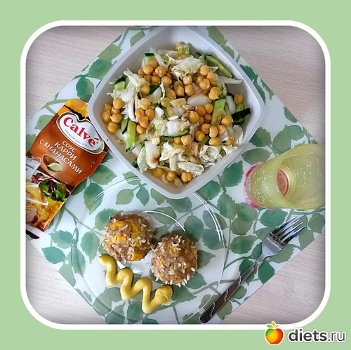 - салат из пекинской капусты с огурцом, петрушкой и нутом (заправка - соевый соус и оливковое масло)