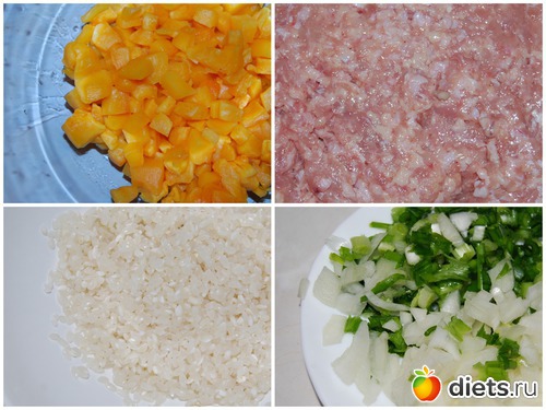 Тыкву очищаем и режем мелкими кубиками, промытый рис, куриный фарш, лук, соль, черный молотый перец.