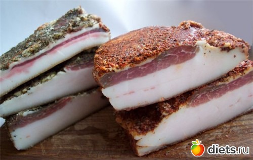 Жаль только не знаю сколько калорий в таком сале.Ещё отвариваю такое сало в луковых шкурках , лишний жир вываривается и очень вкусно получается.