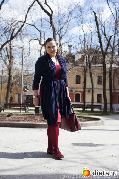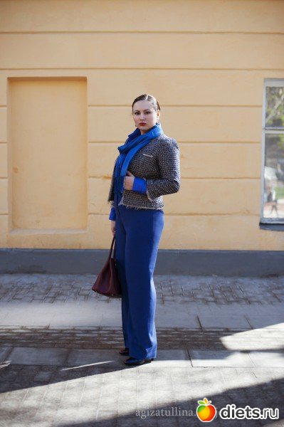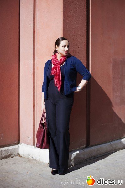 В образе этот вертикальный эффект еще усилен вертикально завязанным шарфом яркого цвета — именно на него обращает внимание глаз в первую очередь, когда вы смотрите на фотографию. Акцент к лицу — верный способ дать окружающим понять, куда направить свое внимание. Привлечь внимание к лицу означает отвлечь внимание от других частей фигуры — улавливаете? Сделайте так, чтобы окружающие обращали внимание на ваши достоинства в первую очередь. Вы можете взять этот шарф в том цвете, который вам идет к лицу — правильно подобранный цвет позволит выглядеть свежее. Тогда вы сможете выдержать общий образ в темных тонах, которые стройнят фигуру, не потеряв при этом свежести у лица.