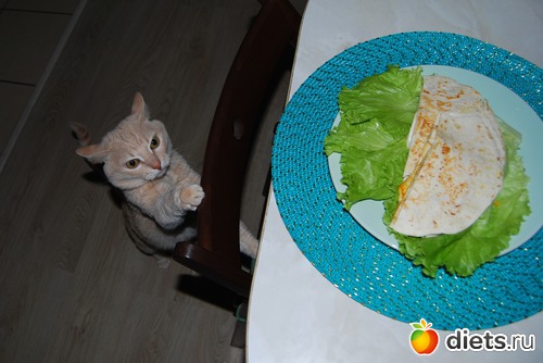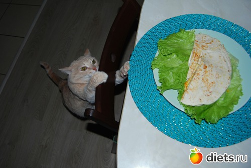 Как только я поставила тарелку с готовым блюдом на стол на стол и взяла в руки фотоаппарат, дабы запечатлеть сие лакомство, как котэ внезапно оживился и стал совершать недвусмысленные активные действия, пытаясь подцепить салфетку вместе со стоявшей на ней тарелкой (несколько кадров чего мне удалось заснять), и которые через пару секунд завершились стремительным прыжком на стол, чуть ли не в тарелку - и всё это безобразие в моем-то присутствии!