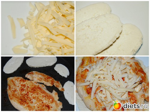 Куриную грудку отбить, посолить, обжарить с 2-х сторон на сковороде, посыпать куркумой, добавить на эту же сковороду ломтики адыгейского сыра - обжарить с 2-х сторон.