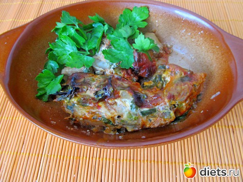 обед: хек, запеченный со сметаной с зеленью и томатной пастой, чай