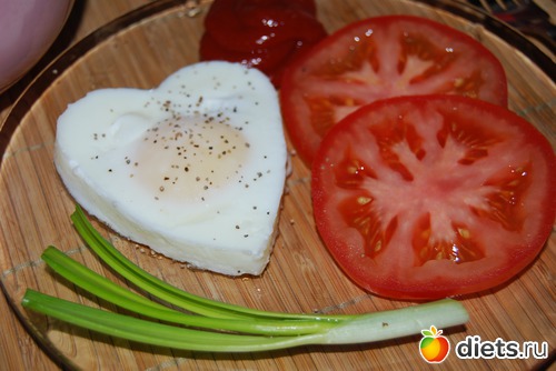 Как же я по ней соскучилась (почему-то она совсем выпала у меня из меню, а тут насмотрелась на фото-отчёты девочек, разманилась, прям), что зажарила её, да не просто так, а в формочке в виде сердечка, да подала с помидором, кетчупом, да с зелёным лучком!