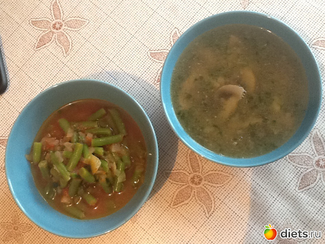 Обычный грибной суп на воде и тушеная зеленая фасоль. На ужин будет эта же фасоль и гречка Читать полностью