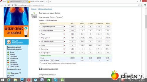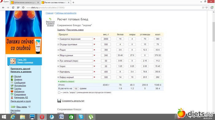 я рассчитала калорийность моей диетической окрошки в калькуляторе, выходит 35 калорий на 100г