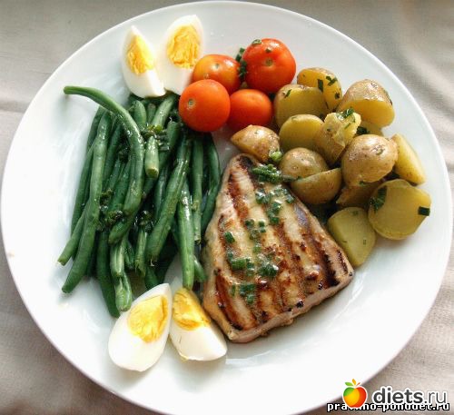 На тарелку выложите кусочек мяса, фасоль, картофель, украсьте порезанным яйцом и помидорками черри.