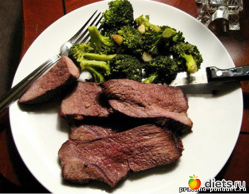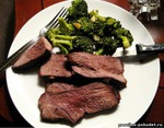 Мясо натереть солью и специями, завернуть в фольгу и запечь в духовке при 180 градусах в течении 40 минут. Брокколи отварить в подсоленной воде, а затем слегка обжарить на сковороде с 1.ч. ложкой масла. Мясо нарезать, выложить на тарелку, а рядом выложить брокколи.