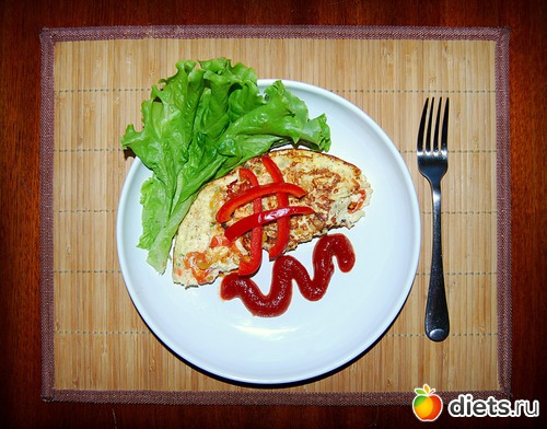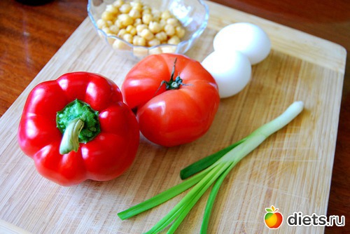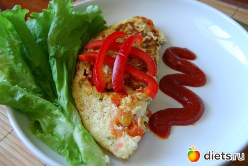 Омлет из куриных яиц и молока с жареными помидорами, нутом и зеленым луком, на гарнир: болгарский перец и салатные листья, кетчуп.