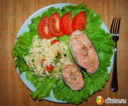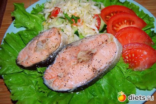 Положила ломтики семги в пароварку на 15 минут, а за это время приготовила лёгкий салатик из свежих овощей.