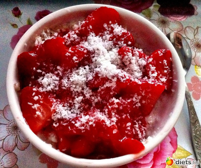 а что у тебя на завтрак?клубника и кокосовая стружка вроде,или там еще что-то?