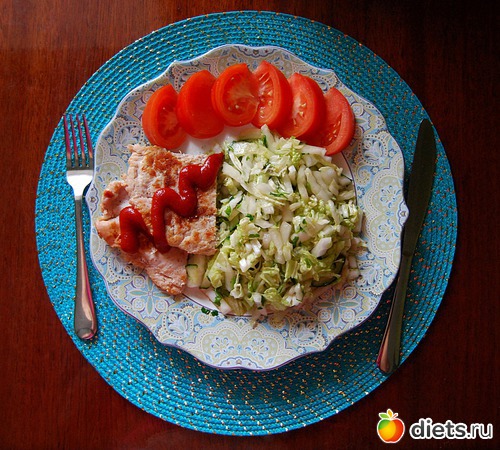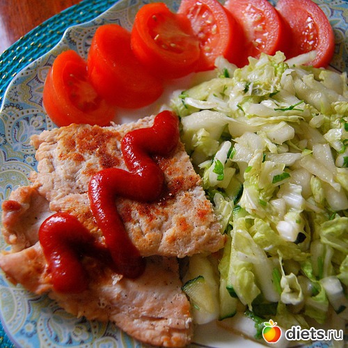 Бифштекс из индейки, салат, половинка помидора, кетчуп.