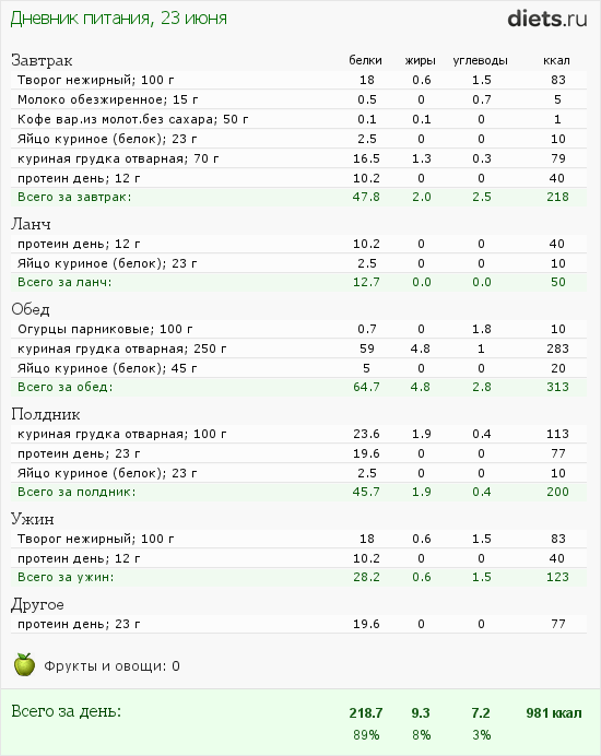 у меня это рацион перед морем) ну а вообще еще такой рацион перед соревнованиями делают. Я уже скоро выходить из него буду - тоже очень увлекательный процесс. Поняла что при плавном заходе в такую жесткую сушку меня не колбасит вообще и мне супер комфортно так питаться. Когда пыталась резко сесть на сушку - были срыв за срывом