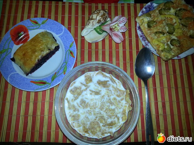 Завтрак – чудо хлопья с молоком, пицца с курицей и кусочек черничного рулета (сладко!)