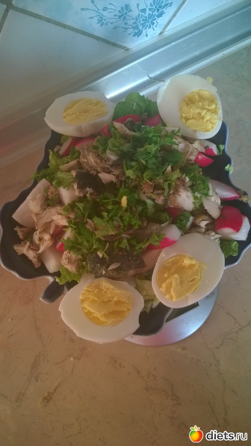 А на ужин я сделала себе салатик с пекинской капусты, редиски, вареных яичек, тунца и все это заправила соевым соусом.