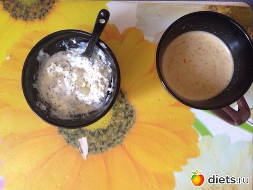 На завтра предполагается только жиросжигающий капучино, А я привыкла плотно завтракать, поэтому если я просто выпью кофе, то через час умру от голода. Я добавила 100 гр. творога с ложкой йогурта