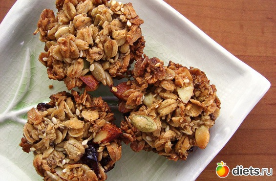 Ингредиенты: 3–4 ст. овсяных хлопьев, 1/2 ст. необжаренного миндаля, 1/2 ст. подсолнечных семечек, 1/6 ст. кунжута, 1 ст. л. молотой корицы, 1/2 ч. л. молотого имбиря, щепотка соли, 1 ст. несладкого яблочного детского пюре, 3 ст. л. меда, 2 ст. л. оливкового масла.