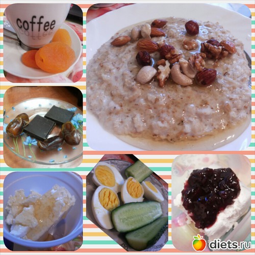 завтрак - овсяные хлопья с молоком, медом и орехами, 3 финика, 2 дольки горького шоко