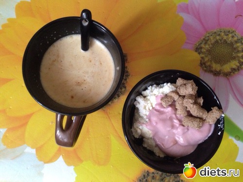Капучино и 100 гр творога обезжиренного + 2 ложки вишневого йогурта + чуток отрубей ржаных