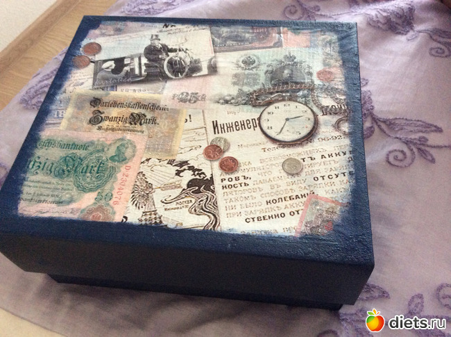 Коробка для мелочей Подарили мужу на д/р графин со стаканами и упакован он был в красивую коробочку, которую жалко было выкинуть. Тем более коробочка уже с отделениями, осталось только задекорировать снаружи. Сделала докупаж в мужском стиле и теперь муж свои мелочи( нужные ) складывает в коробочку, а не бросает на полку!