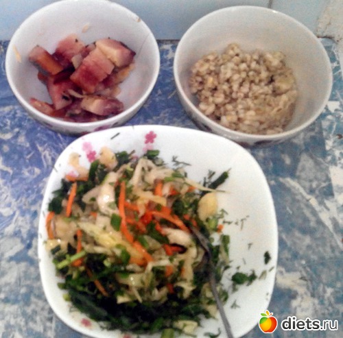 Покупной салат из капусты смешал с зеленью. Плюс перловая каша. И немного селедки копченой.