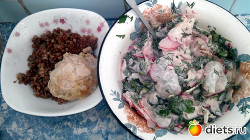 Гречневая каша, фрикаделька и салат из редиски, зелени и ряженки.