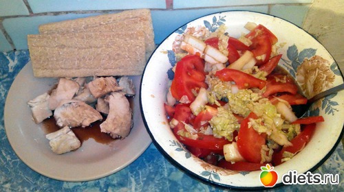 Салат из помидорины и пекинской капусты. Немного куриной грудки, сделанной на пару. И хлебцы...