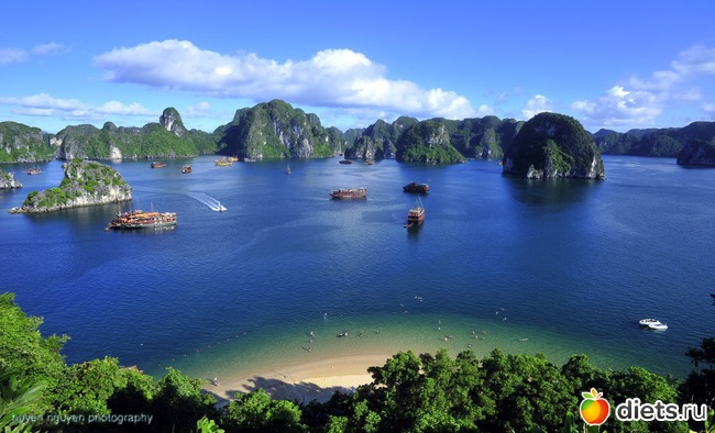 Из изумрудной воды Тонскинского залива выступает около 3000 крошечных островов, обрамленных пляжами и гротами, которые по легенде выдолблены хвостом огромного дракона. Вьетнамцы рассказывают следующую легенду о создании 3 тысяч островов бухты Халонг: давным-давно, когда вьетнамский народ боролся с китайскими захватчиками, с неба для помощи вьетамцам было послано семейство драконов, которые стали выплевывать драгоценные камни, превращавшиеся в острова, которые неожиданно возникли перед идущими в море китайским судами и разбили их в щепки. После победы драконы решили остаться в этих местах. Дракониха - мать семейства поселилась в бухте, которую с тех пор называют Халонг, что в переводе с вьетнамского означает "там, где дракон спустился в море".