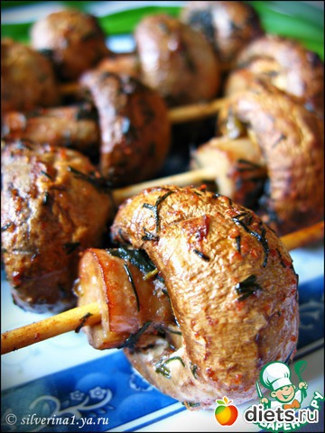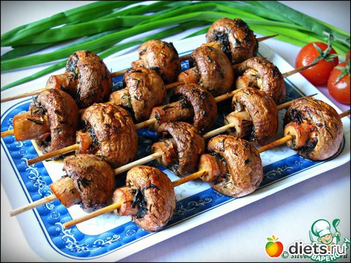 Затем нанизать грибы на шпажки ( которые заранее замочили в воде ) и положить их на форму.