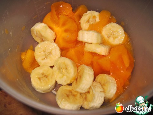 Мякоть хурмы и замороженный банан переложить в емкость, добавить лимонный сок.