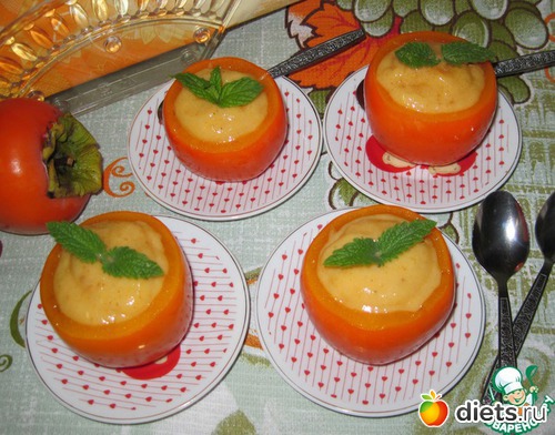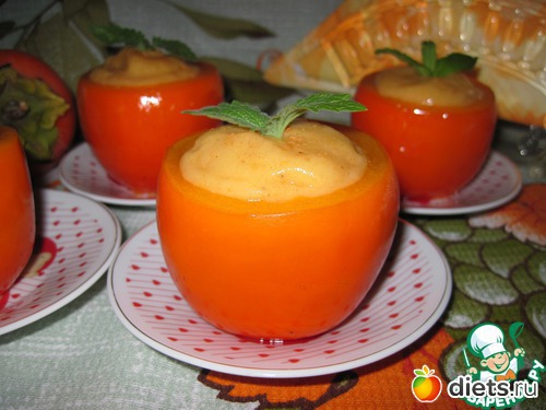Заполнить стаканчики из хурмы мороженым, слегка посыпать корицей и украсить свежими листиками мяты.