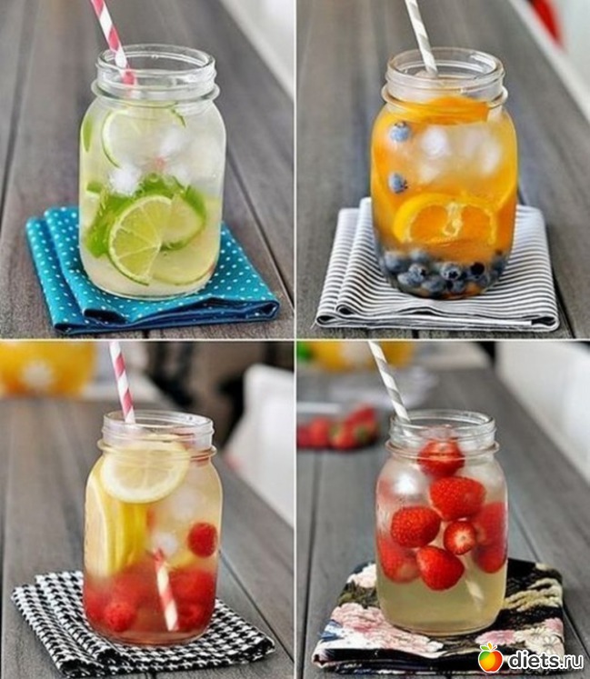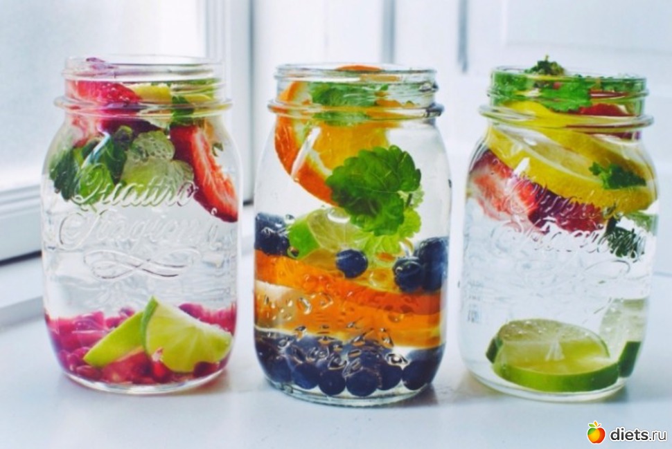 ► Фрукты. Любые, какие вы любите, кроме бананов. Фрукты должны быть спелыми, чтобы максимально раскрылся их вкус и аромат. Хорошо класть в воду ягоды, цитрусовые, ананас или арбуз.