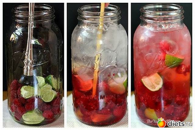Два лайма разрежьте на четвертинки, отожмите руками сок в банку, затем четвертинки бросьте в банку. Добавьте горсть малины. Немного подавите фрукты, но только слегка. Добавляем лёд, воду, перемешиваем, закрываем крышкой, ставим в холодильник.