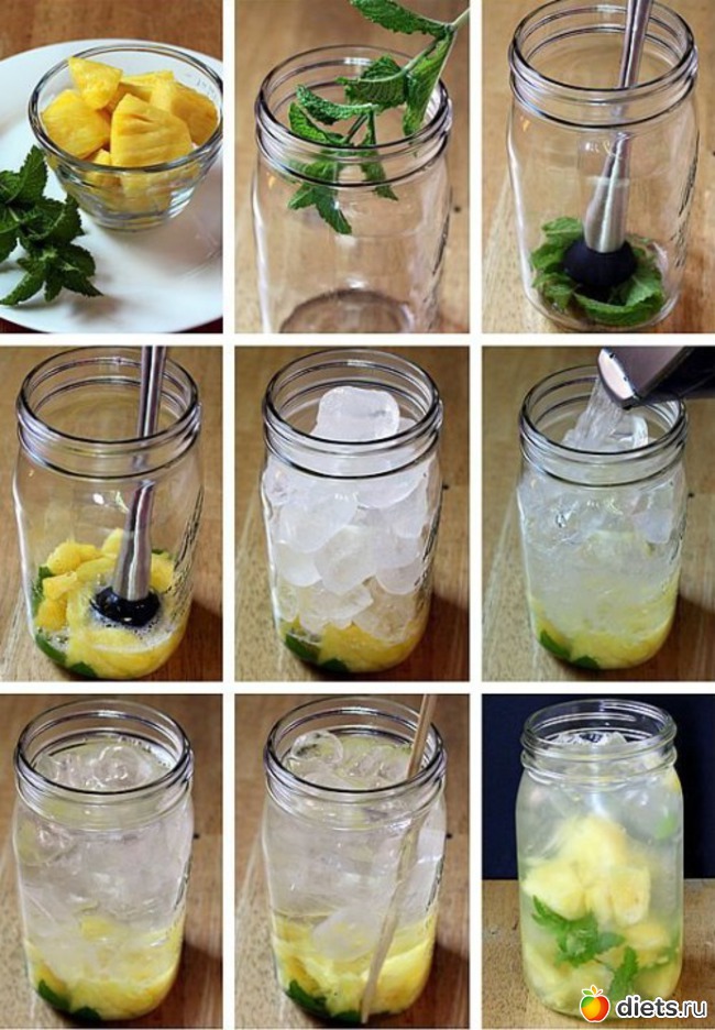 Веточку мяты или листочки мяты (если хотите, чтобы они красиво плавали в банке) положите в емкость. Немного перетираем мяту ложкой, вы должны почувствовать её аромат. Добавляем кусочки ананаса, разминаем ещё. Лёд, вода, перемешиваем, закрываем крышкой, ставим в холодильник.