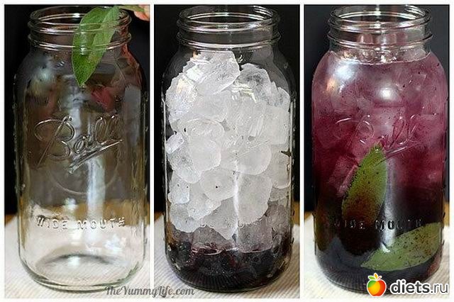 Получается тонкий и освежающий вкус. Добавляем листья шалфея в банку, немного разминаем. Добавляем горсть ежевики, разминаем. Лёд, вода, перемешиваем, закрываем крышкой, ставим в холодильник.