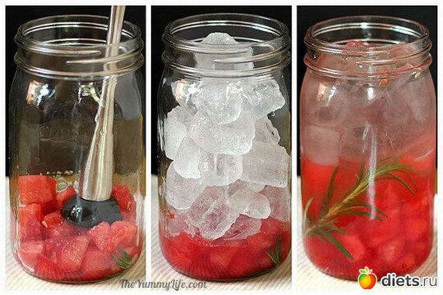 Веточку розмарина кладём в банку, немного разминаем, даже при небольшом усилии розмарин очень быстро отдаёт свой аромат, так что слишком не усердствуйте. Добавляем кубики арбуза, очень слегка разминаем. Лёд, вода, перемешиваем, закрываем крышкой, ставим в холодильник.