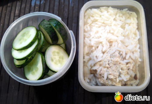 Тут тоже все просто. Рис с фрикаделькой и огурец.