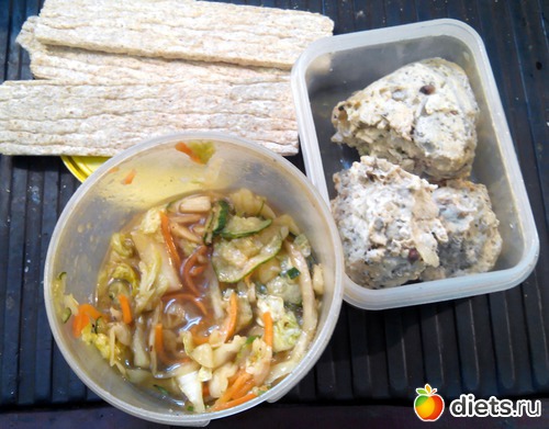 Остатки салата, фрикадельки и хлебцы.